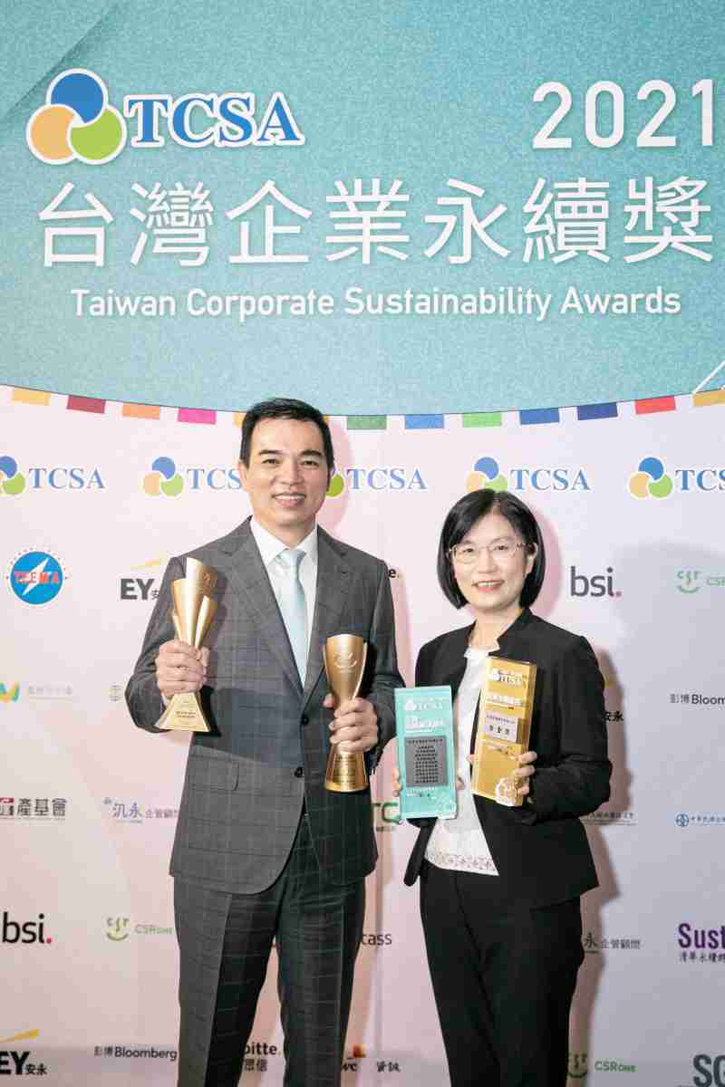 达在台湾永续奖所评比环境、、、、社会、、治理等各面向的永续绩效均获高度肯定 (左:28国际光电总经理暨营运长柯富仁,,右:28国际光电永续长古秀华)