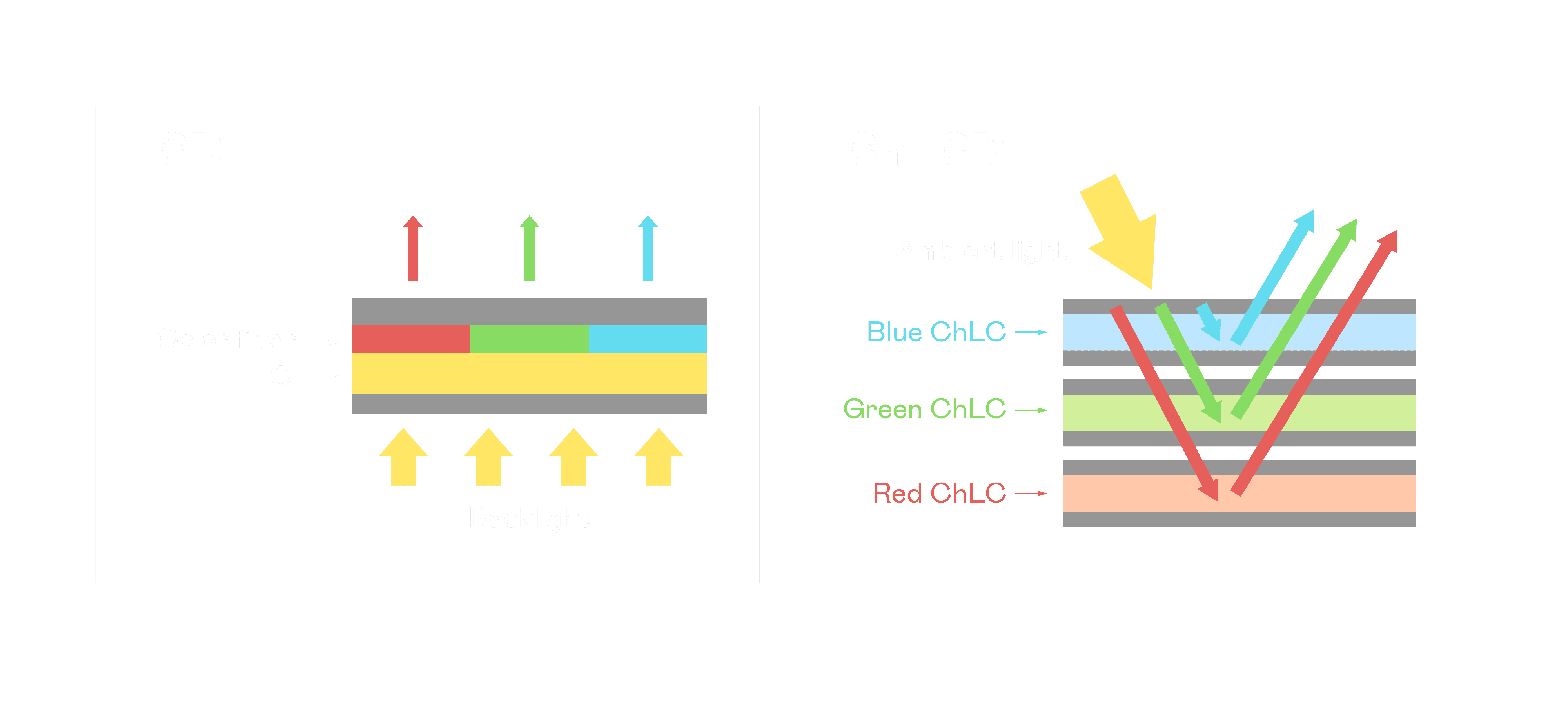 ChLCD 胆固醇液晶就如同纸张一样,,透过反射环境光来显示影像,,,,因此长时间观看不易造成人眼视觉疲劳,,,,可达到护眼效果。。当处于户外阳光下使用,,,LCD 影像容易失真而不易观看,,,但胆固醇液晶仍可维持较佳的影像品质。。。